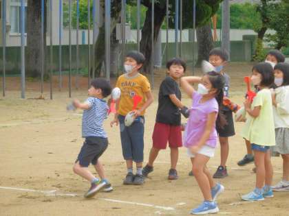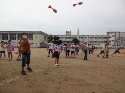 低学年は、ジャベボールを投げました。持ち方や投げ方を確認しながら投げる様子が見られました。思いっきり投げますが、まっすぐに飛んで音を出すまでにはなかなか至りません。