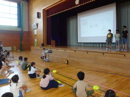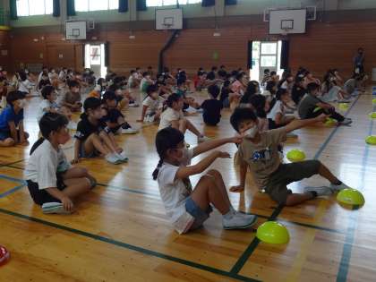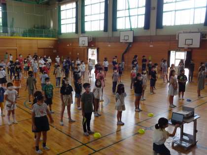 そこで、曲のイントロクイズを出題しました。「となりのトトロ」や「校歌」等、全校の子供たちが知っている曲を選びました。答えを言うときは、みんなで声を合わせました。