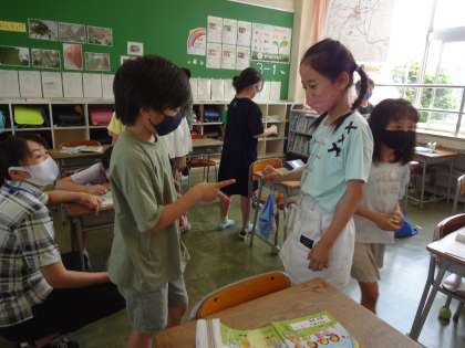 英語で色の言い方を学んだ子供たちは、多くの友達と、何色が好きなのかを尋ねたり答えたりする英会話の活動をしました。