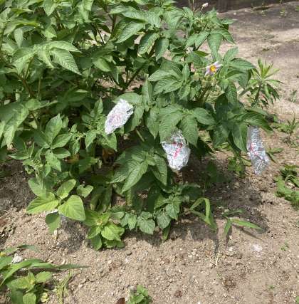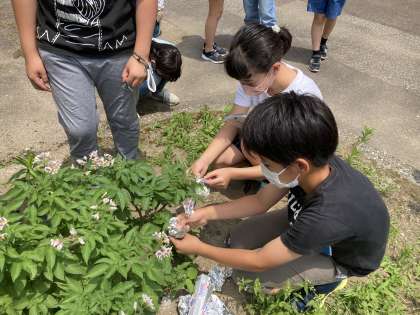 植物の葉に日光が当たるとでんぷんができるかを調べる実験の準備をしました。葉をアルミホイルでおおい、日光が当たらないようにします。次の日に、アルミホイルを外して、ヨウ素液につけて、でんぷんがあるか確認します。