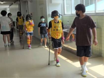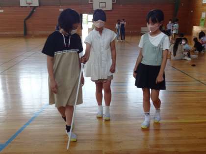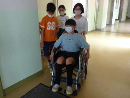 5年生は、「ともに生きる」をテーマに、福祉について学習しています。今日は、「みんなが過ごしやすい、やさしいまち」を目指して、いろいろな人の立場を体験しました。高齢者や車椅子に乗る人、目の不自由な人の疑似体験や、介助する人の立場の経験を通して、みんなが過ごしやすいまちを考えるきっかけとなりました。