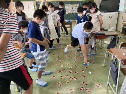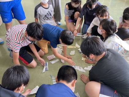 先生からリクエストがあったゲームで、先生対6年生で勝負しました。「新聞パズル」「新聞じゃんけん」「神経衰弱」「たけのこたけのこにょっきっき」をしました。結果は3対1で6年生が勝ちました。心を一つにして、助け合う場面が多く見られました。