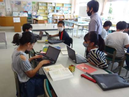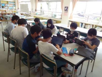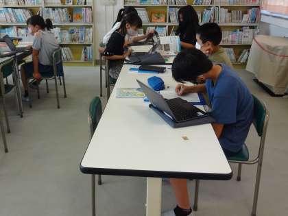 今日は、各グループのテーマ「食品ロス」「地球温暖化」「ポイ捨て」について、現状や問題点を図書やインターネット検索で調べています。