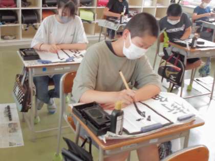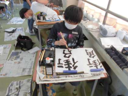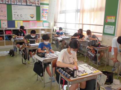 三つの部分でできている漢字の組み立て方を理解して、形を整えて書くことを目標にして、「街角」を書きました。街の字が横に広がってしまいがちになり、難しいですが、手本を見ながら丁寧に書きました。来週は清書の予定です。