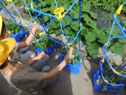 あさがおのつるが伸び始めてきたので、みんなで支柱を立てました。