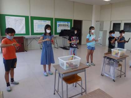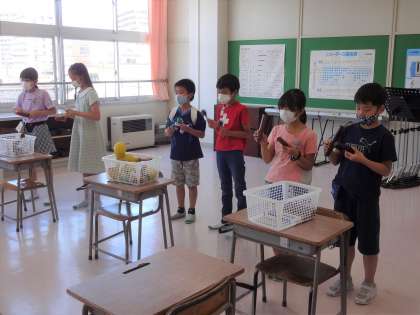 子供たちが手にしているのは、ギロ、マラカス、クラベスです。