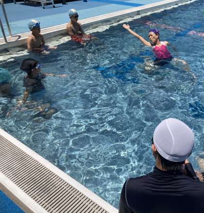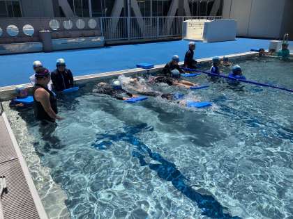 6年生は、4限にスポーツ指導者派遣事業を行いました。2つのグループに分かれて、3名の指導者の方々に、腕の回し方やバタ足の仕方等を教えていただきました。
