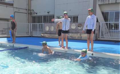 暑い時間のプールでの水泳学習を避け、1限に時間割変更をして行いました。
