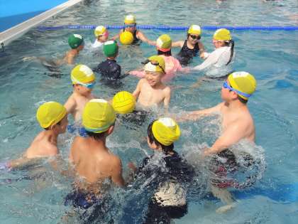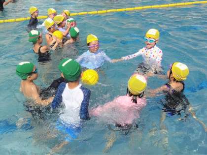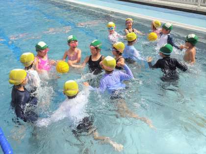 1つのグループは、円陣になり、4チーム対抗の水中ボール運び競争をしました。競争なので、とても盛り上がりました。
