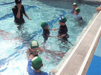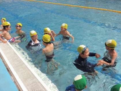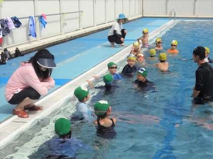 もう一つのグループは、バタ足練習、「ぶくぶく、ぱっ。」と息を吐く練習、2人組になって頭まで潜る練習等をしました。潜れる人は、プールの底にタッチすることにも挑戦しました。