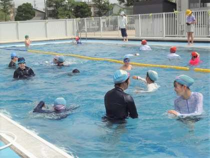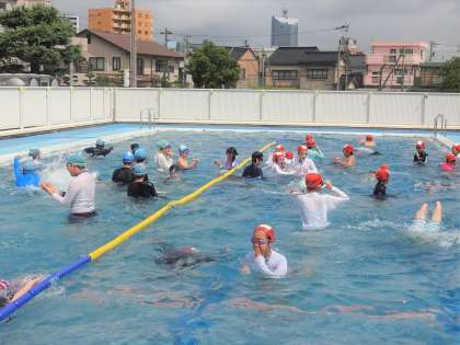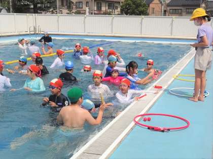 泳ぐ練習の前に、色団対抗の石(沈む物)拾い競争をしました。