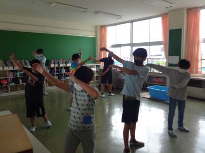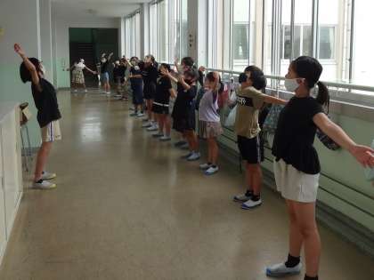 今日から、朝の体力つくり活動(やなトレ)のメニューが変わりました。夏休みに向けて、「ラジオ体操」を始めました。