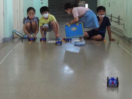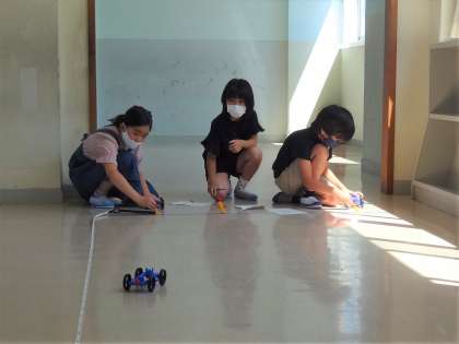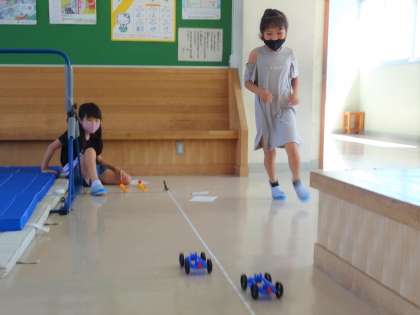 車にゴムがついており、それを伸ばして離すと、どこまで車が走るか距離を測っています。