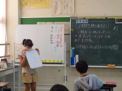 「1学期を振り返ろう」の活動で、1学期に頑張ったこと、1学期に達成したこと、2学期に頑張りたいこと等を、「かるた」の読み札のように表しました。