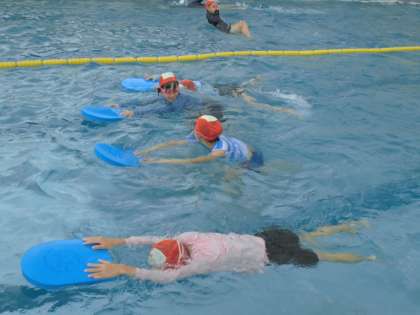 もう片方の班は、平泳ぎの足の使い方を中心に練習しました。先生の指示をよく聞いて、集中して練習に取り組んでいます。