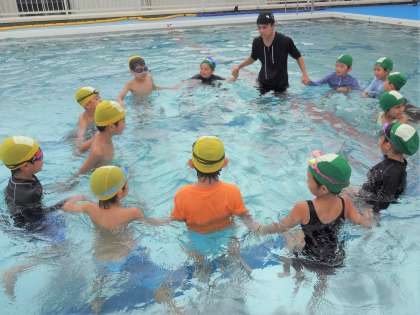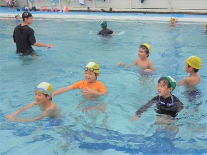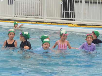 水慣れグループは、手をつなぎながら円陣を大きくしたり小さくしたりする活動や、鬼ごっこ等をして楽しく過ごしました。子供たちの歓声が上がりました。