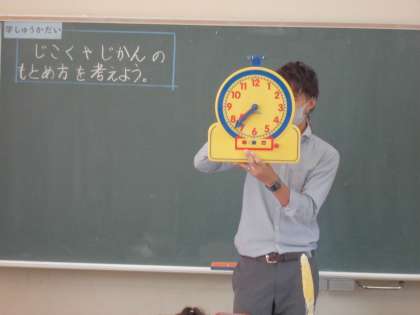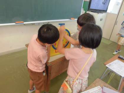 プリントで時刻を求める問題に取り組んだときに、「実際に大きな時計で考えていいよ」と言われると、すぐに触りに行って考えました。