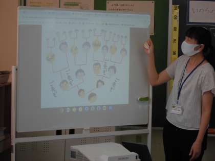 お墓参りに行ったことがあるかどうか、行って何をするのかを発表しました。その後、自分の命がご先祖様からつながっていることを知り、自分の命のつながりについて考えたことをまとめました。
