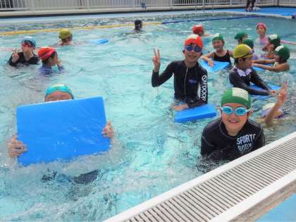 約70名の子供たちが、歓声を上げながら楽しそうに遊んだり、泳いだりしています。