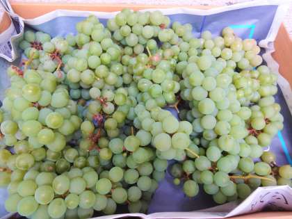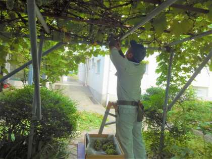 中庭で育てているブドウが実りました。食べ頃になったので、用務員さんに収穫してもらっています。