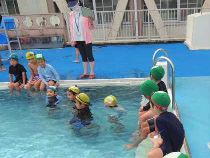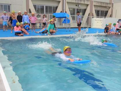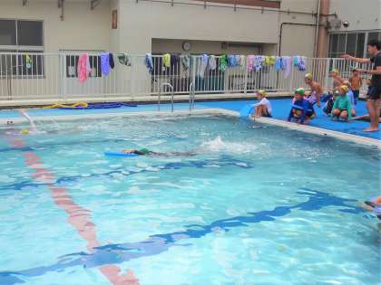 泳ぎが得意な子供は、ビート板を使わず、悠々と25mプールをターンしました。