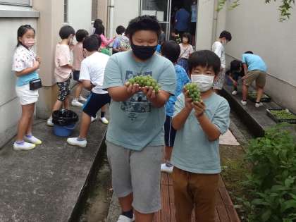 昨日収穫したブドウを、業間休憩や昼休憩に、希望者が食べられるようにしました。