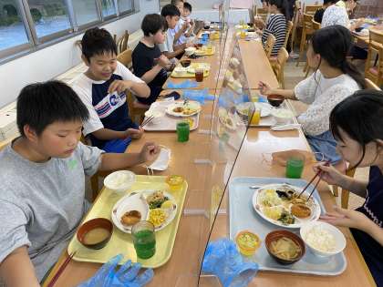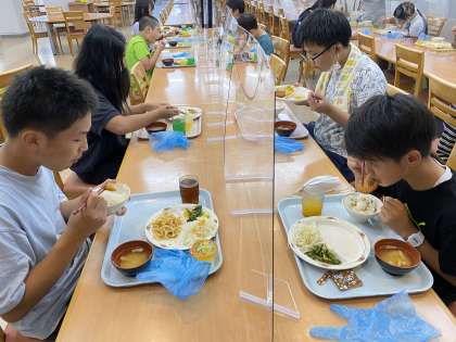 夕食はバイキングです。黙食ですが、子供たちの好きそうなメニューが多く、喜んで食べています。