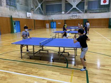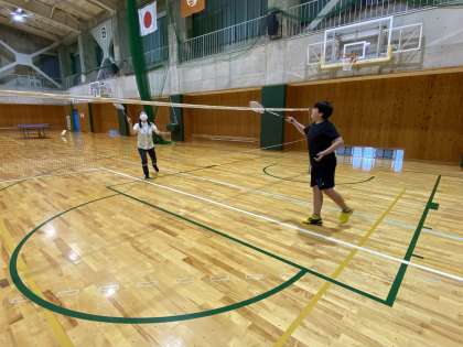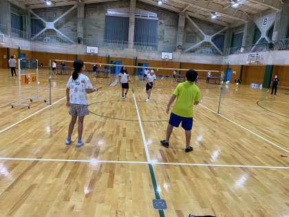雨天で、砂像づくりができなかったため、体育館でバドミントンと卓球をしています。