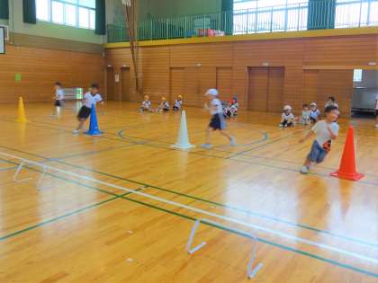 色団ごとに並んだ子供たちの前に、カラーコーンとミニハードルコースが作られました。