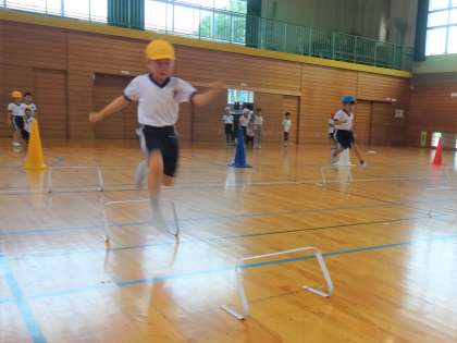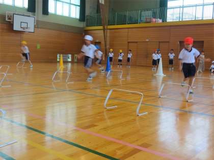 一人一人順番に、回ったり跳んだりしながら、走りました。