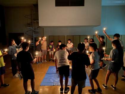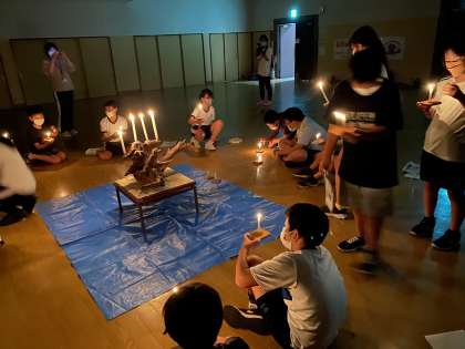 夜の活動は、天候不良で屋外でのキャンプファイヤーができなかったので、屋内でキャンドルセレモニーを行いました。