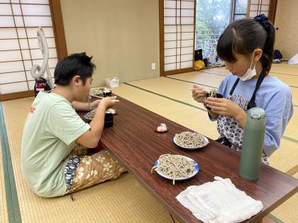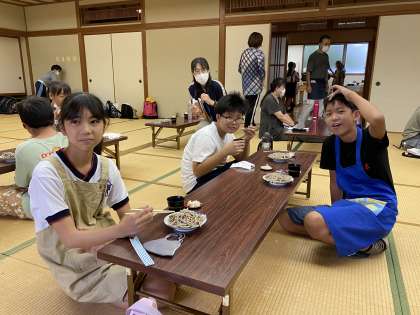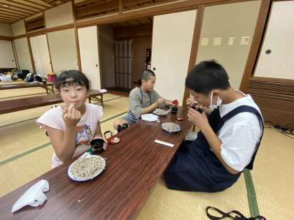 自分たちで作ったそばを茹でてもらって、食べました。自分で作ったそばの味は格別のようで、「おいしい」という声があちらこちらから聞こえてきました。