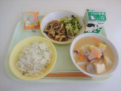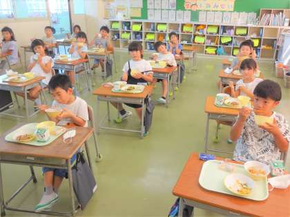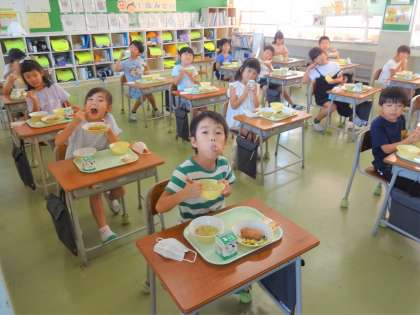 今日の給食は、特別メニューの「月見献立」です。子供たちは、おいしそうに味わっています。