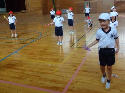 右手で8回、左手に持ち替えて8回、頭の上で8回等、様々な位置で回して楽しみました。