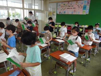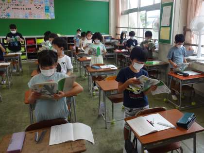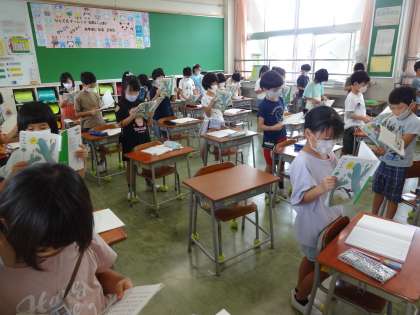 先生の一文ずつの範読を真似て、交互に読みました。みんなの声も気持ちも合っています。