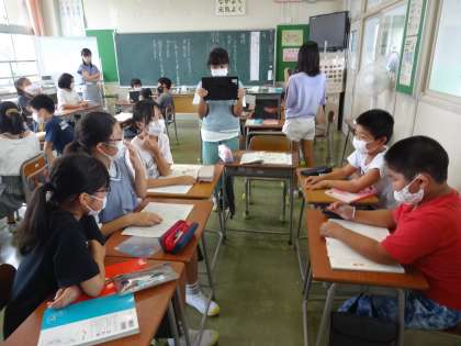 最後に、動画を撮っている校長先生役の子供が、どちらのチームが説得力のある発言ができていたかなどを評価します。