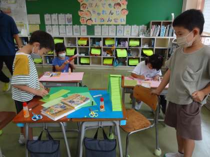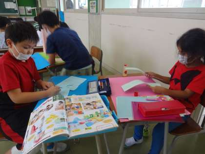 紙を折って立つ形を見付け、工夫して工作します。絵も描きます。