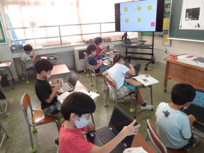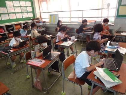 子供たちは、教科書とクロームブックを手元に置いて学習しています。