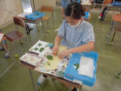 中庭で様々な種類の葉っぱを採集しました。それらの形や色を利用して、作品づくりに取り組みます。