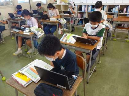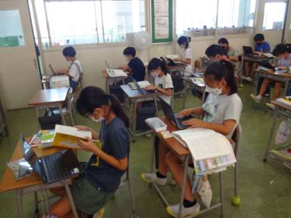「内容」「問い」「分かったこと」の欄に分かれているまとめの表は、先生がデータで配付し、子供たちは、クロームブックを使って、様々な内容について文字入力していきました。