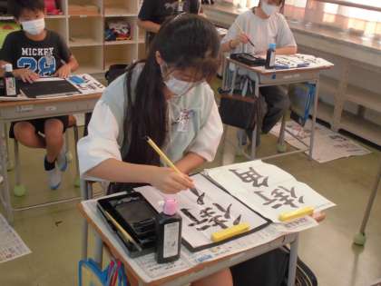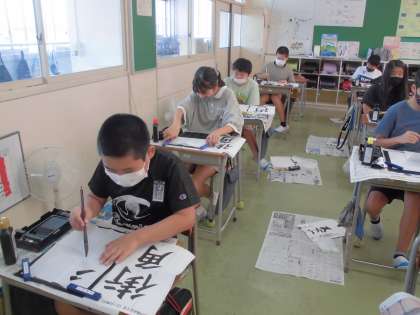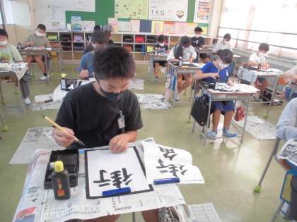 三つの部分でできている漢字の組み立て方を理解して形を整えて書くことを意識して、「街角」を書きました。街の字の三つの部分が、左から、「広い」「せまい」「広い」となって字が横に広がらないように注意しました。6年生らしく集中して書きました。