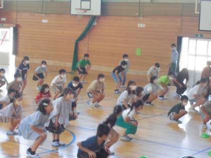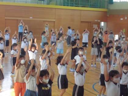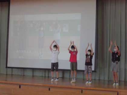 その後、来週から始まるやなトレの内容を発表してくれました。8時10分から教室で行う運動です。運動委員が手本を示してくれた後、全校で取り組みました。体力向上につなげましょう。
