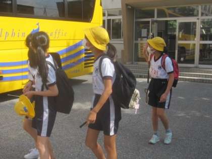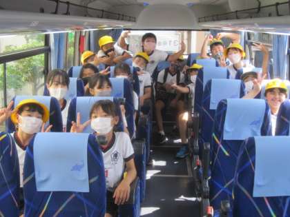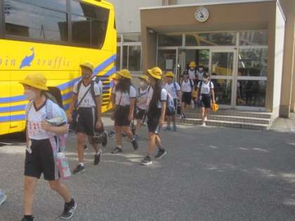 青空の下、6年生は「チャレンジ陸上記録会」に向けて出発しました。