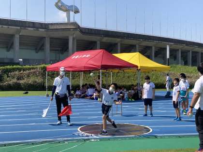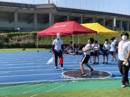 男子ソフトボール投げです。自己最高記録が出るようにウォーミングアップを入念して臨みました。高記録が出た時は、別の学校からも自然と拍手が出て、交流が深まりました。