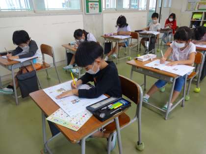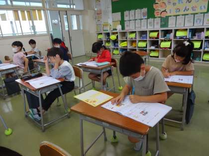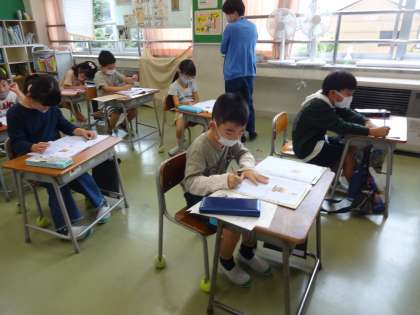 筆順や読み方を確認し、漢字ノートに書きました。特に、1画目と2画目の長さの違いを意識しました。自分で見直して、書き直す子供もいました。