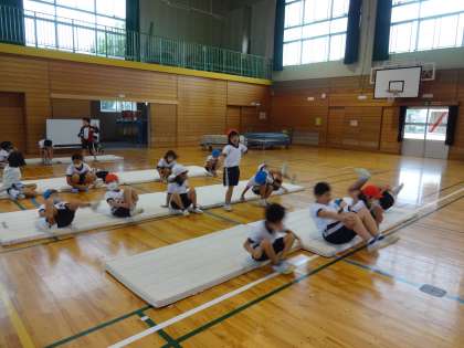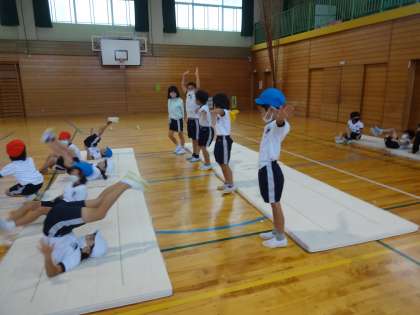 マット運動では、スムーズに転がって立つ練習を何度も繰り返しました。友達とタイミングを合わせるのに苦労しています。