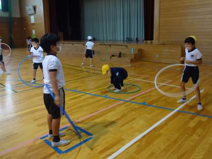 マット運動、フラフープ運動、縄跳び運動の3つのコーナーに分かれて取り組みました。
