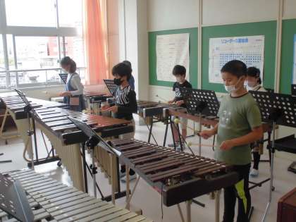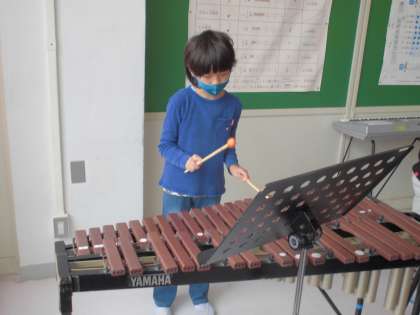 「ゆかいな木きん」の曲を、歌に合わせて木琴で演奏しました。ローテーションしながらみんなが木琴を演奏しました。簡単そうに見えて意外に難しいことが分かりました。