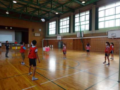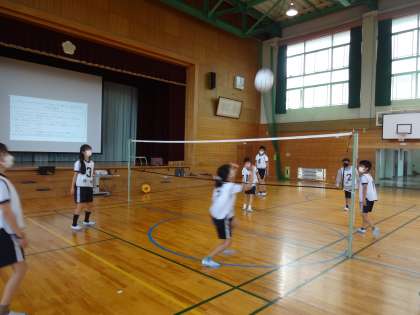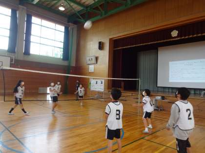 ビニル製のボールを使ったソフトバレーボールの授業をしています。