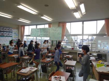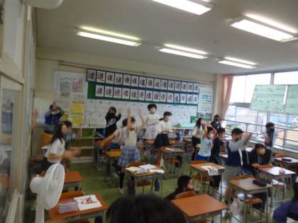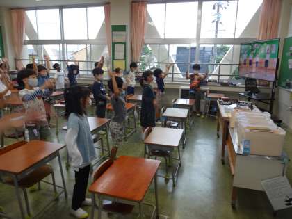 教室のモニターに映し出される映像を見ながら、リズム体操をしています。
